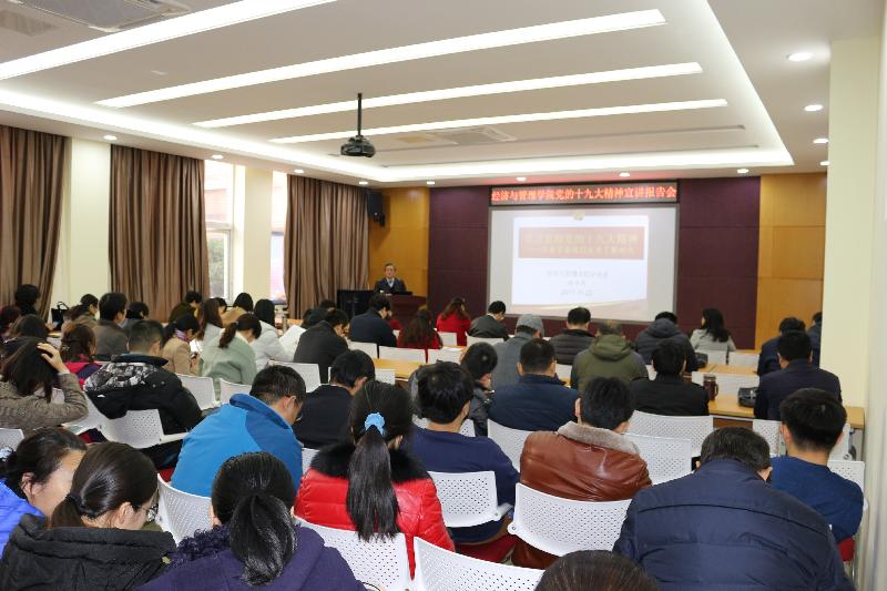 11月22日,经济与管理学院举行十九大精神宣讲报告会,经济与管理学院分党委书记、学校十九大精神宣讲团成员赵中利作宣讲报告,学院分党委成员以及全体教职工参加了此次会议。