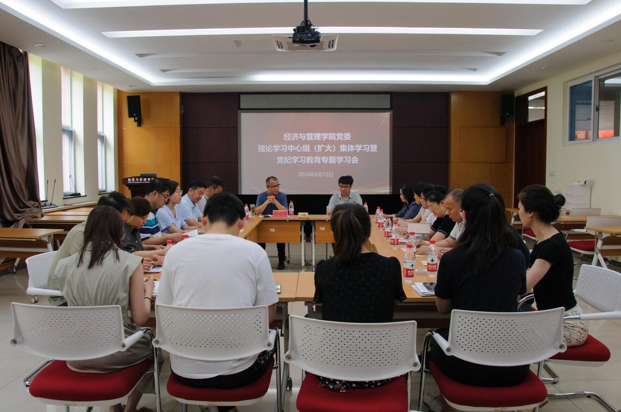 6月12日,经济与管理学院党委理论学习中心组(扩大)集体学习暨党纪学习教育专题学习会在1号教学楼B104会议室召开。学校党委副书记李贞涛、党委组织部副部长崔维参加,经济与管理学院党委书记赵晖主持。