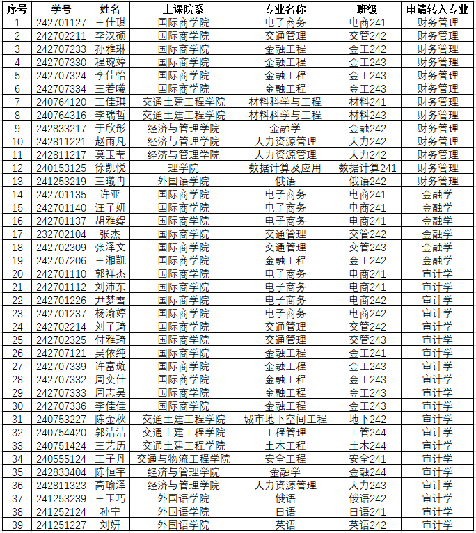 根据《山东交通学院普通全日制本专科学生转专业管理办法(修订)》(鲁交院发﹝2020﹞71号)相关要求和《经济与管理学院2025年度本科学生转专业接收计划》,我院对申请转入我院学生提交的材料进行了审查,现将报名资格名单予以公示,公示期为2025年9月12日-9月14日,如有异议请联系经济与管理学院教学办公室,电话:0531-80687728。