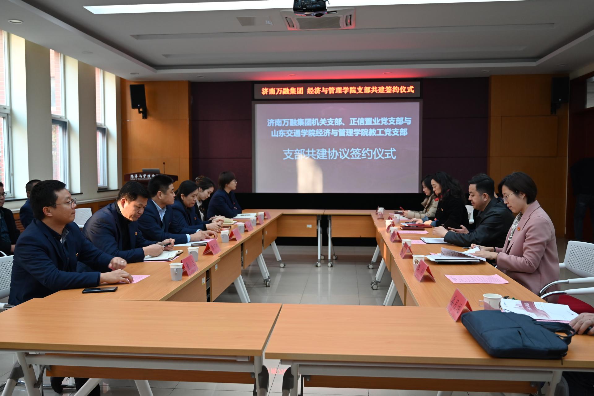 与会人员围绕党建工作创新、组织共建、队伍共建、活动共建等内容深入探讨。经济与管理学院四个教工党支部与济南万融集团机关党支部、正信置业党支部分别签署结对共建协议。